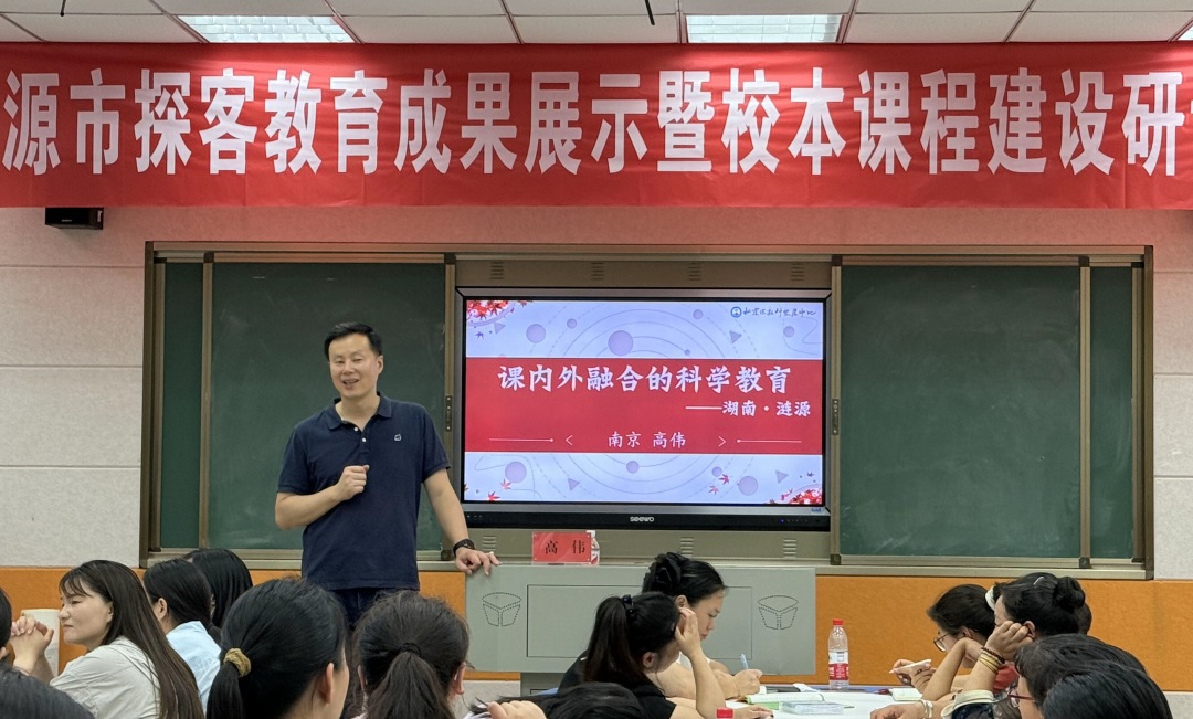 回应当地教育发展需求,支持涟源本地教师专业成长。特邀探客教育课程研发专家、南京市栖霞区科学教研员高伟老师作《课内外融合的科学教育》专题研讨分享。他以南京晓庄小学《舌尖上的麦芽糖》这一校本研修课程为例,深入浅出地阐述如何通过课程设计,基于真实情境生成驱动问题,因地制宜打造校本课程,启发儿童的好奇心与探求欲。高伟老师的分享内容丰富、见解独到,让在场的教师们收获颇丰,对科学教育教学工作有了新的思考与启发。
